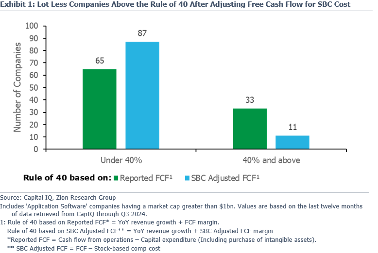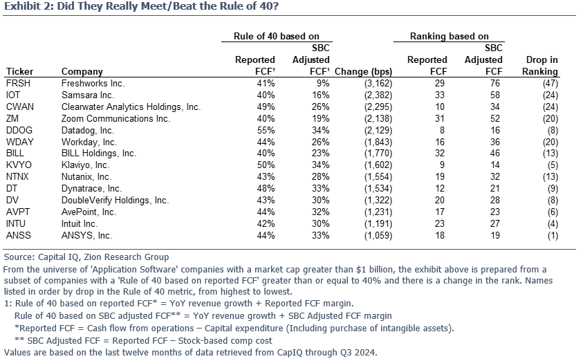 For our purposes and to put companies on a level playing field we start by calculating the Rule of 40 as the sum of the YoY growth rate in total revenue plus the free cash flow (cash flow from operations less capex) margin (using the most recent reported last twelve months). We refer to this metric as the “traditional” Rule of 40 or the one based on reported FCF. Next we calculate a revised Rule of 40 by making just one adjustment to the traditional metric, we reduce free cash flow by the amount of stock based comp (SBC) cost (i.e., we’re not giving companies credit for the SBC cost addback to operating cash flow) to arrive at an SBC adjusted free cash flow and free cash flow margin that we use in our SBC adjusted Rule of 40 which is then compared against the traditional metric.