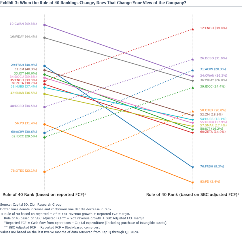 Zeroing in on the 22 companies that had previously met/beat the Rule of 40 that dropped under 40% after our adjustment, we found that 14 of them (listed in Exhibit 2) also experienced a drop in their Rule of 40 ranking against our universe of Application Software companies. Notice for some, like ANSS or INTU, the rankings didn’t change much at all, while for others like FRSH and IOT their ranking dropped significantly.